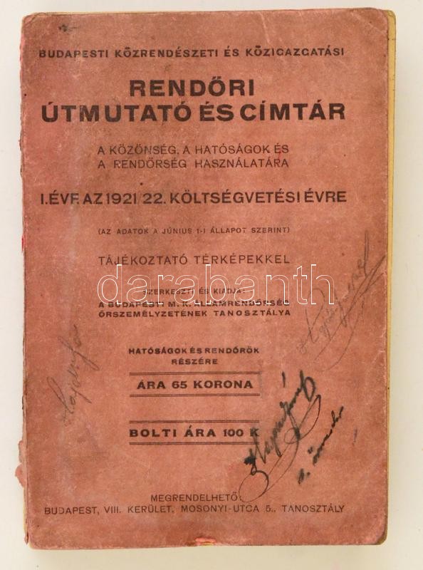 1921-1922 Budapest közrendészeti és közigazgatási rendőri útmutató és címtár. A közönség, a hatóságok, és a rendőrség használatára. I. évf. az 1921/22. költségvetési évre. Bp.,(1921),"Pátria",512 p. Kiadói papírkötésben, megviselt állapotban, a borítója szakadozott, a hátsó borító hiányzik, a gerince sérült, hiányos.