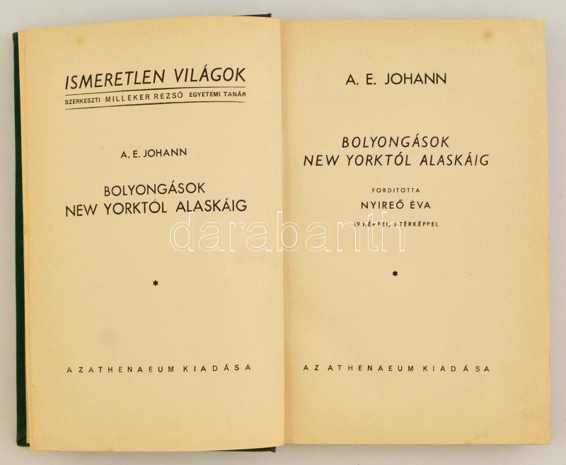 A. E. Johann: Bolyongások New-Yorktól Alaszkáig. Fordította: Nyíreő Éva. Ismeretlen világok. Bp., é.n., Athenaeum, 256 p. Kiadói aranyozott egészvászon kötésben. Fekete fehér képekkel, térképekkel illusztrálva. Jó állapotban