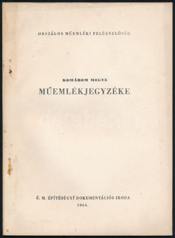 Komárom megye műemlékjegyzéke. Országos Műemléki Felügyelősség. Bp.,1964, É. M. Építésügyi Dokumentációs Iroda. Kiadói papírkötés. Megjelent 500 példányban.