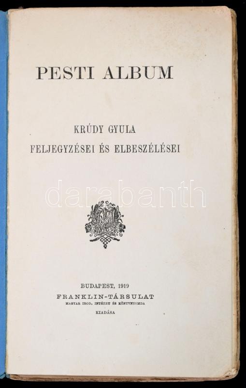 Krúdy Gyula: Pesti album. Krúdy Gyula feljegyzései és elbeszélései. Bp... https://www.darabanth.com/hu/326-Gyorsarveres/326.0/Konyvek/Konyvek-Utazas-helytortenet~1500002/Krudy-Gyula-Pesti-album-Krudy-Gyula-feljegyzesei-es-elbeszelesei-Bp-1919-Franklin-150plus2-~II1778316
