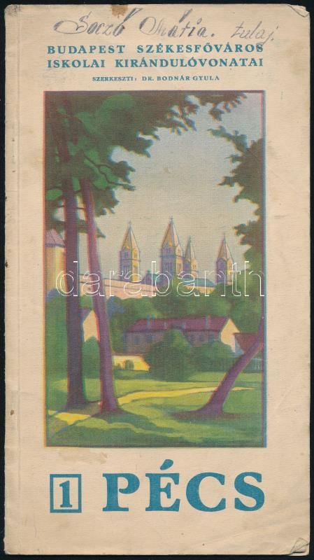 cca 1930-1934 Budapest székesfőváros iskolai kirándulóvonatai 1.: Pécs. Bp., 1934, Bp. házinyomdája, 16 p. Kiadói papírkötés, ceruzás névbejegyzéssel, bejegyzéssel. Képes ismertető füzet térképekkel.+Pécs Szab. Kir. Város Idegenforgalmi Irodájának ismertető prospektus.