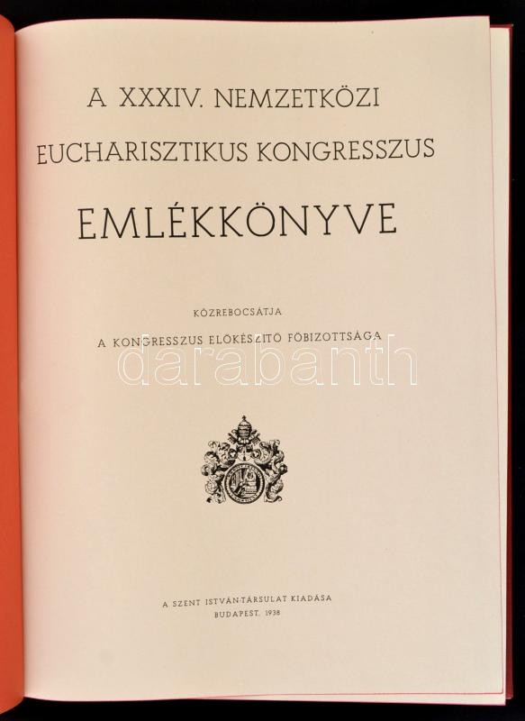 A XXXIV. Nemzetközi Eucharisztikus Kongresszus emlékkönyve. Közrebocsájtja a Kongresszus előkészítő főbizottsága. Bp., 1938, Szent István-Társulat. Fekete-fehér fotókkal illusztrálva. Kiadói aranyozott egészvászon kötés, festett lapélekkel, jó állapotban.