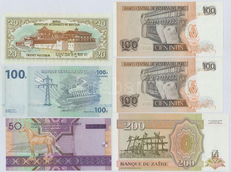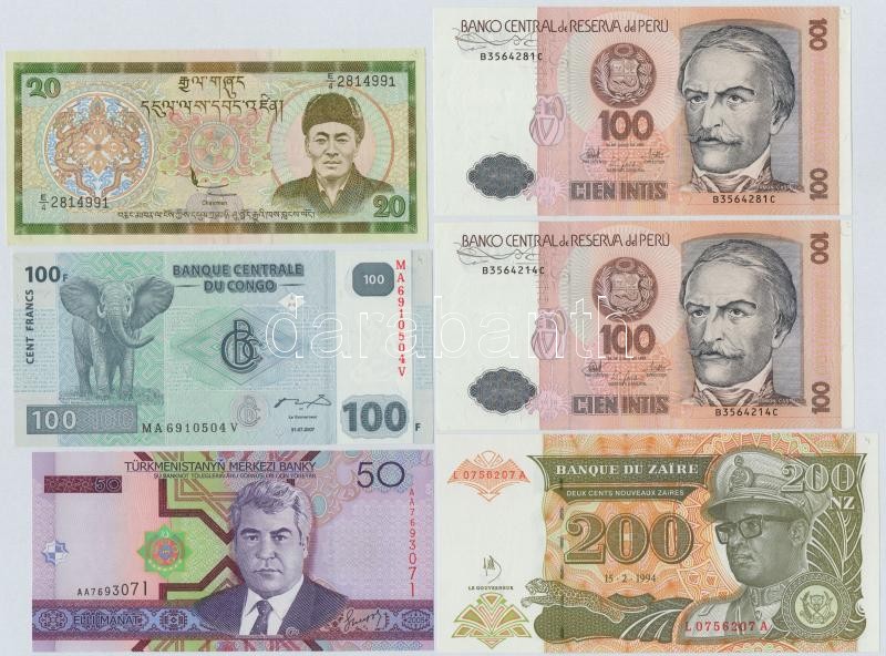 10db-os vegyes külföldi bankjegy érdekesebb darabokkal, közte Bhután, Peru, Türkmenisztán, Zaire T:I-III