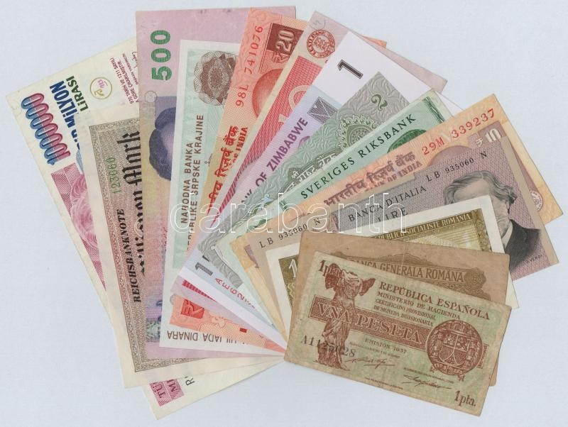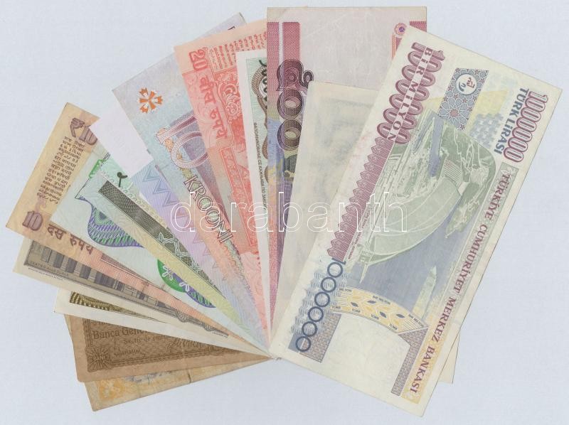 14db-os vegyes külföldi bankjegy tétel, közte India, Olaszország, Románia, Svédország T:I-III