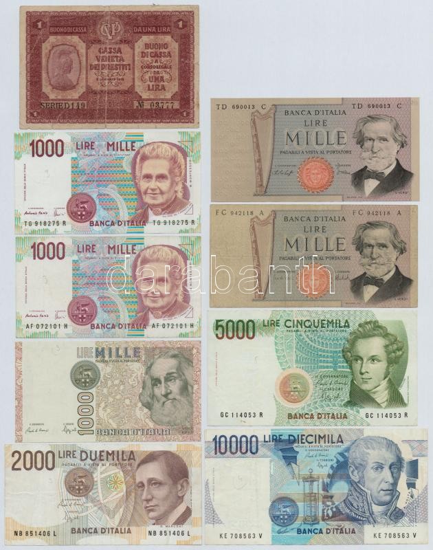 Italy 1918-1990. 1 ... https://www.darabanth.com/hu/326-Gyorsarveres/326.0/Numizmatika/Kulfoldi-bankjegyek~2000012/Olaszorszag-1918-1990-1L-10000L-9x-TIII-III--Italy-1918-1990-1-Lira-10000-Lire-9x-CF-V~II1813429