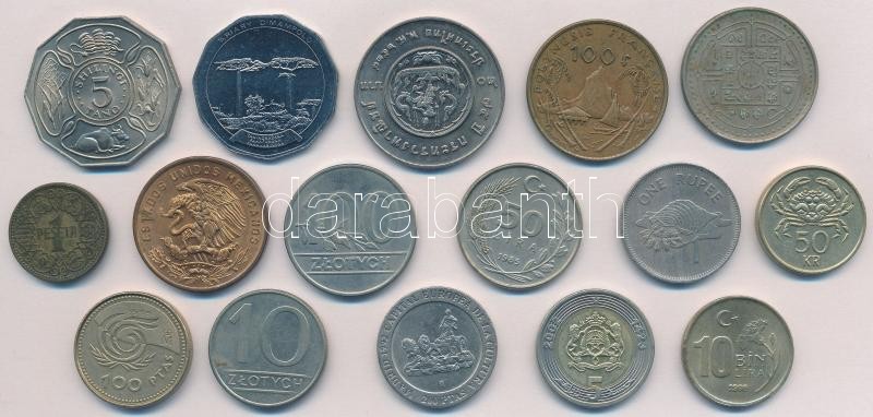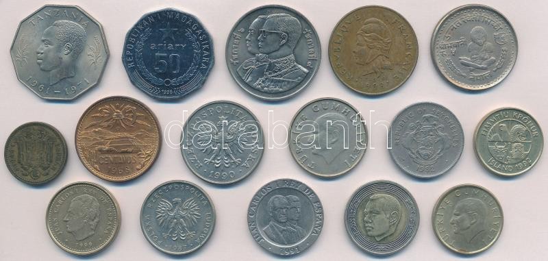 16db-os vegyes fémpénz tétel, közte Franciaország, Mexikó, Thaiföld, Tanzánia, Izland, Lengyelország, Törökország, Madagaszkár és Seychelle-szigetek T:vegyes 16pcs of coins, inculding France, Mexico, Thailand, Tanzania, Iceland, Poland, Turkey, Madagascar and Seychelles C:mixed