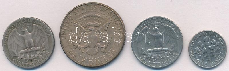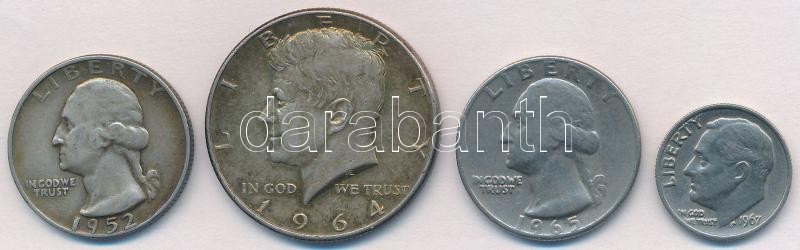 Amerikai Egyesült Államok 1952D 1/4$ Ag "Washington" + 1964. 1/2$ Ag "Kennedy" + 1965. 1/4$ Cu-Ni "Washington" + 1967. 1d Cu-Ni "Roosevelt" T:2