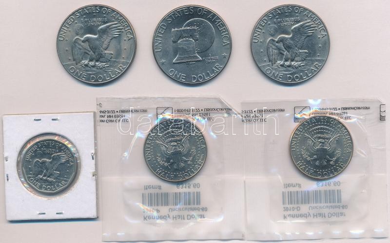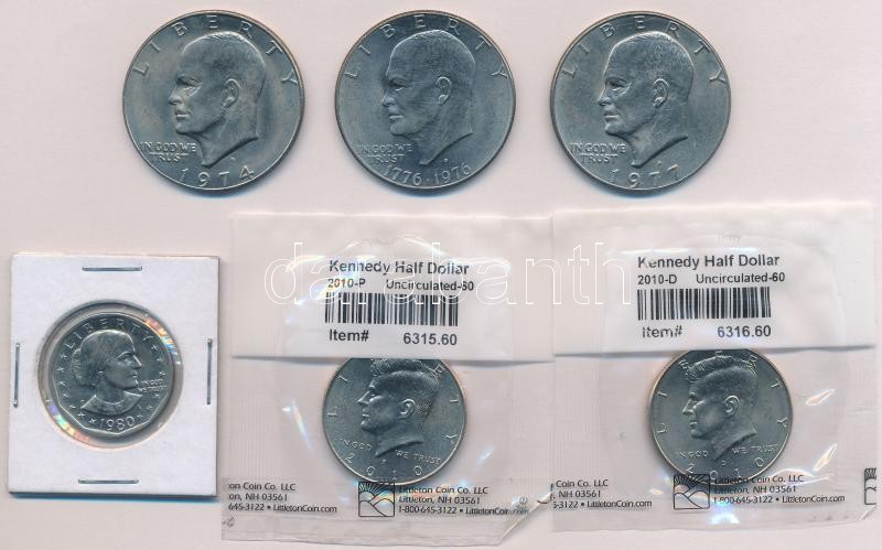 Amerikai Egyesült Államok 1974-1977. 1$ "Eisenhower" (3xklf) + 1980. 1$ "Susan B. Anthony" + 2010D 1/2$ lezárt tasakban + 2010P 1/2$ "Kennedy" lezárt tasakban T:1,1-,2