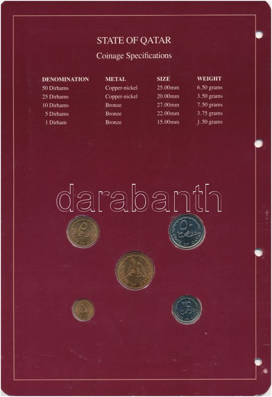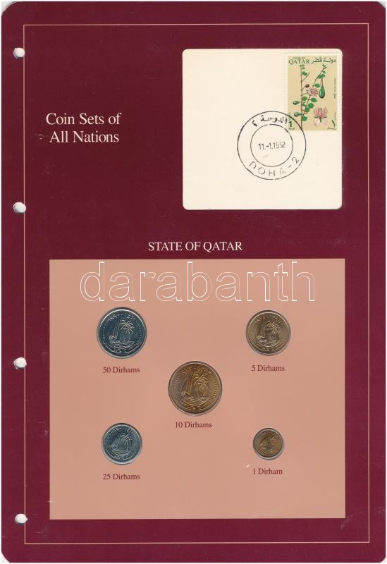 Katar 1973-1990. 1D-50D (5xklf) forgalmi sor karton díszcsomagolásban,... https://www.darabanth.com/hu/326-Gyorsarveres/326.0/Numizmatika/Kulfoldi-fem-es-ezustpenzek~2000013/Katar-1973-1990-1D-50D-5xklf-forgalmi-sor-karton-diszcsomagolasban-belyeggel-T1--Qatar-1973~II1815265