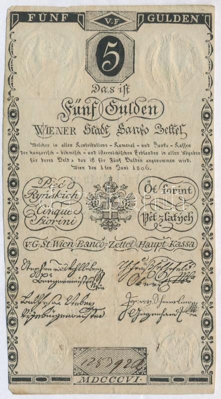 Leírás: 1806. 5G "Bécsi városi bankócédula" T: III szép papír Habsburg Monarchy 1806. 5 Gulden "Wiener-Stadt Banco-Zettel" C:F fine paper