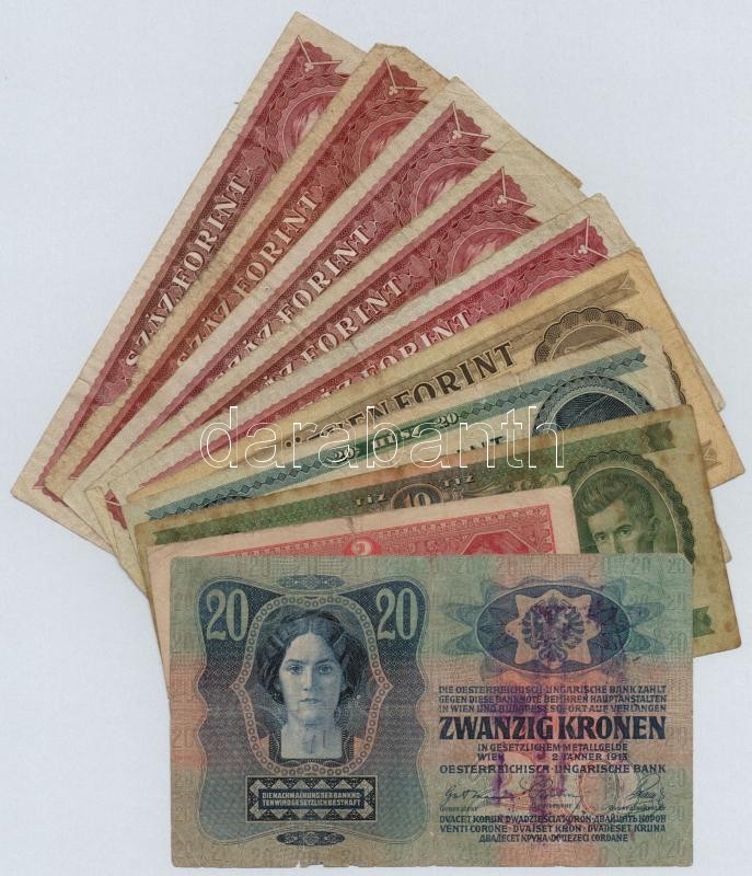 Leírás: 1917. 2K + 1913. 20K felülbélyegzett + 1962. 10Ft + 1980. 20Ft + 1989. 50Ft + 1984-1995. 100Ft (5x) T:III,III-