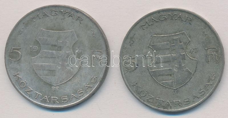 1947. 5Ft Ag "Kossuth" (2x) T:3 https://www.darabanth.com/hu/326-Gyorsarveres/326.0/Numizmatika/Magyar-es-magyar-verdejelu-fem-es-ezustpenzek~2000008/1947-5Ft-Ag-Kossuth-2x-T3~II1816184
