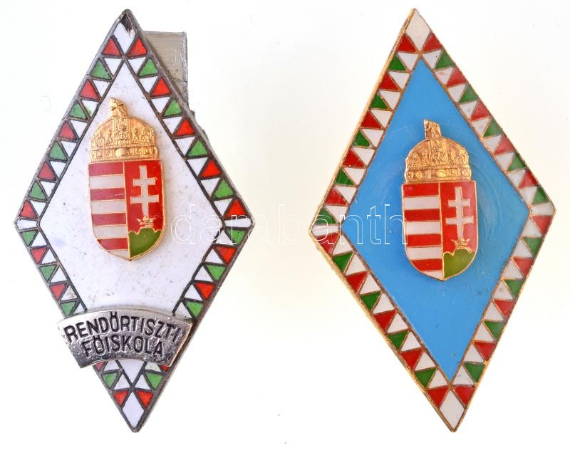Leírás: ~1960-1970. "Rendőrtiszti főiskola" zománcozott jelvény + ~1990-2000. Zrínyi Miklós Nemzetvédelmi Egyetem(?) zománcozott jelvény T:1-,2