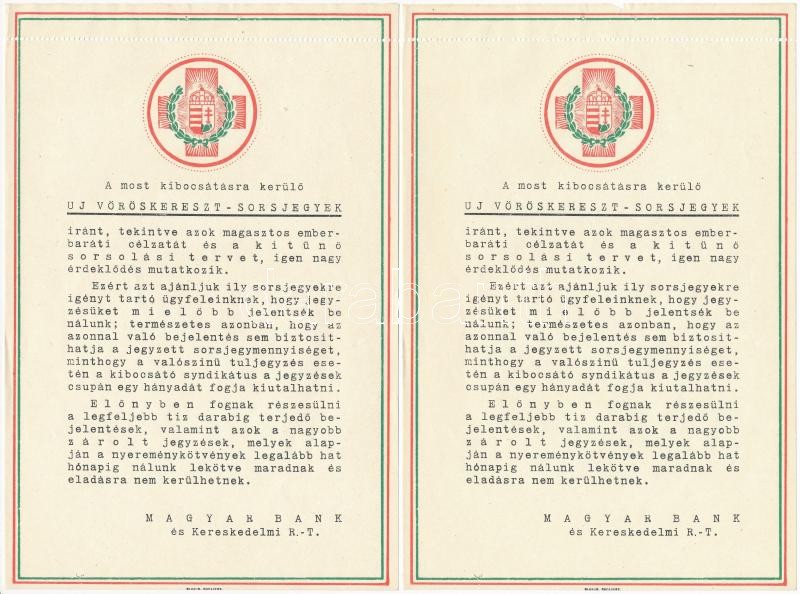 Leírás: ~1930. A Magyar Bank és Kereskedelmi R.T. tájékoztatója az "Új Vöröskereszt-Sorsjegyek" jegyzésével kapcsolatban (4x) T:I