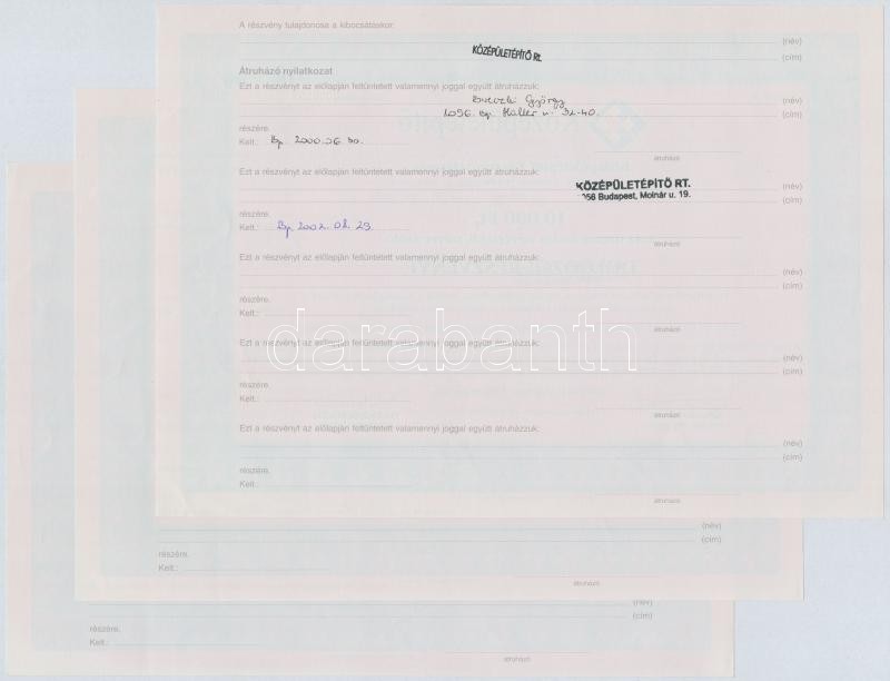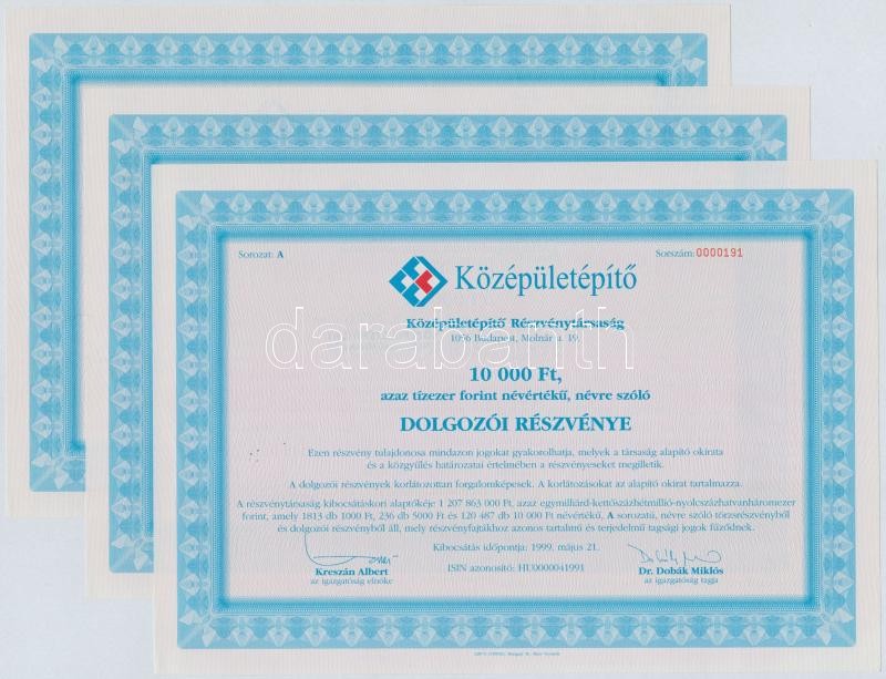 Leírás: Budapest 1999. "Középületépítő Részvénytársaság" névre szóló dolgozói részvénye 10.000Ft értékben (3x) sorszámkövetők, mindhárom hátoldala részben kitöltve, bélyegzéssel T:I,I-