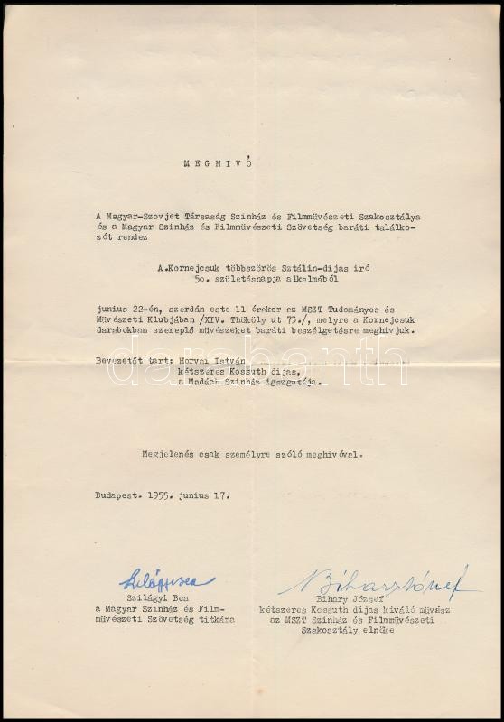 Leírás: 1955 Bp., Meghívó színházi baráti találkozóra, rajta Szilágyi Bea nyomtatott és Bihary József saját kezű aláírásával