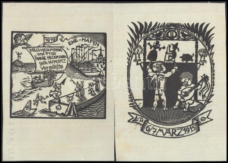 Leírás: Otto Wirsching (1889-1919): 2 db ex libris, fametszet, papír, jelzett a dúcon, 11×12 cm,15×11 cm