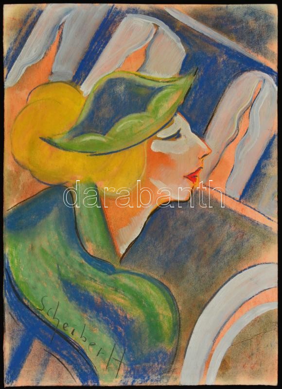 Leírás: Scheiber jelzéssel: Kalapos nő, pasztell, papír, 42×30 cm