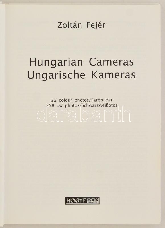 Fejér Zoltán: Hungarian Cameras / Ungarische Kameras. 22 colour photos/Farbbilden, 258 bw photos/Schwarzweißphotos. Bp., 2001, HOGYF Editio. Fekete-fehér és színes képekkel illusztrálva, angol és német nyelven. Kiadói kartonált papírkötés./ Hardcover, in English and German.