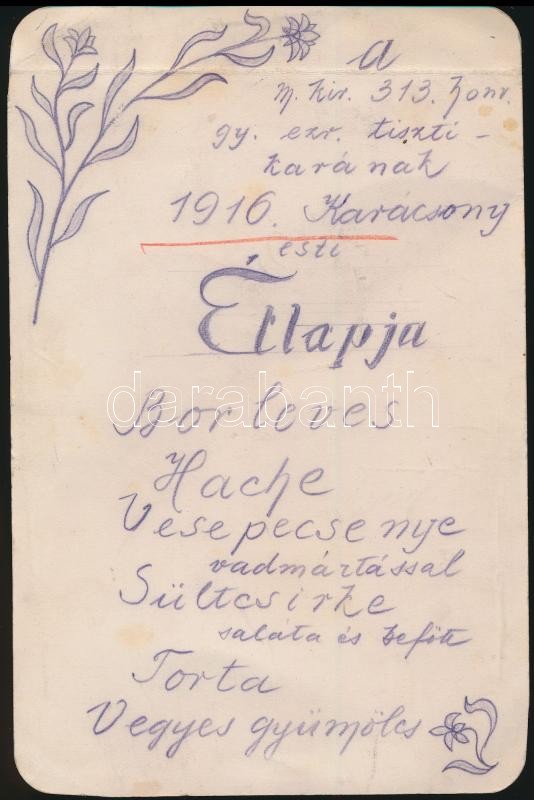 1916 A m. kir. 313. honv. gyalogezred tisztikarának karácsony esti étl... https://www.darabanth.com/hu/327-Gyorsarveres/327.0/Festmeny-mutargy-papirregiseg-egyeb/Militaria~1500029/1916-A-m-kir-313-honv-gyalogezred-tisztikaranak-karacsony-esti-etlapja-a-frontrol-tisztek-a~II1824319