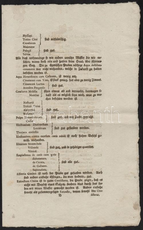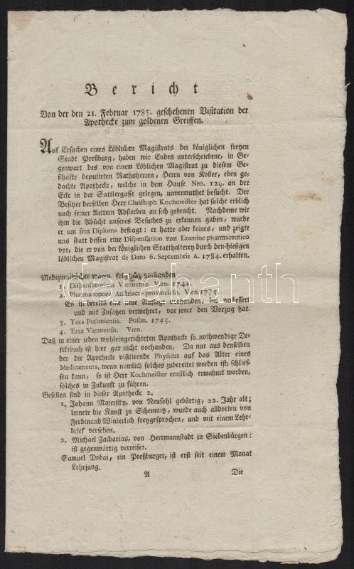 1785 Jelentés a pozsonyi Arany Griff patikában lezajlott vizsgálatról. A személyzet, az eszközök, a gyógyszerek felsorolása. Német nyelven / Report about the Golden Griffin pharmacy 8p.