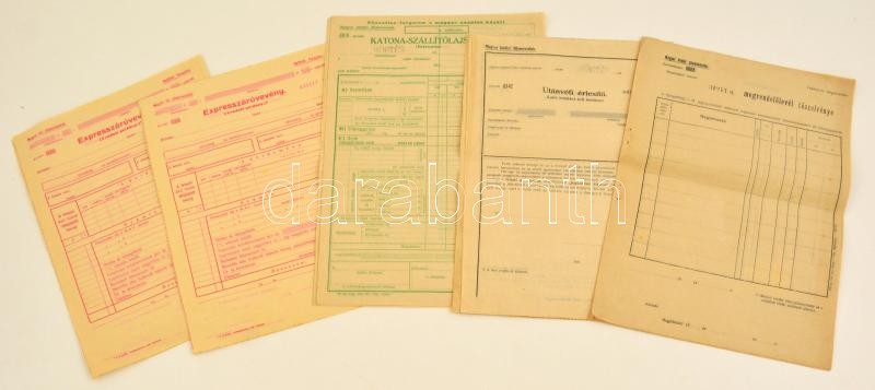 1939-1941 Kitöltetlen MÁV nyomtatványok. Közte 2 db 4 oldalas expresszáruszelvény, 2 db 4 oldalas katona-szállítólajstrom, 2 db 3 oldalas utánvéti értesítő, 2 db 4 oldalas megrendelőlevél, jó állapotban