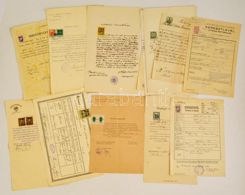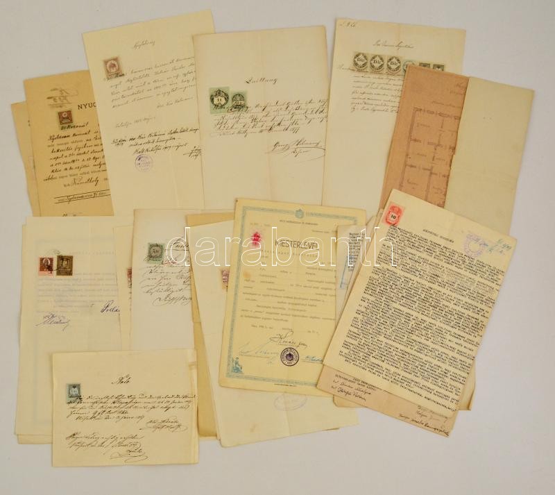 Leírás: 1877-1948 33 db okmánybélyeges okmány, 57 db okmánybélyeggel, jó állapotban