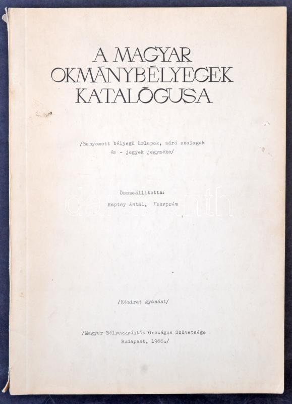 Kaptay Antal: A magyar okmánybélyegek katalógusa (Budapest, 1966) https://www.darabanth.com/hu/327-Gyorsarveres/327.0/Festmeny-mutargy-papirregiseg-egyeb/Okmanybelyegek~1500015/Kaptay-Antal-A-magyar-okmanybelyegek-katalogusa-Budapest-1966~II1819835