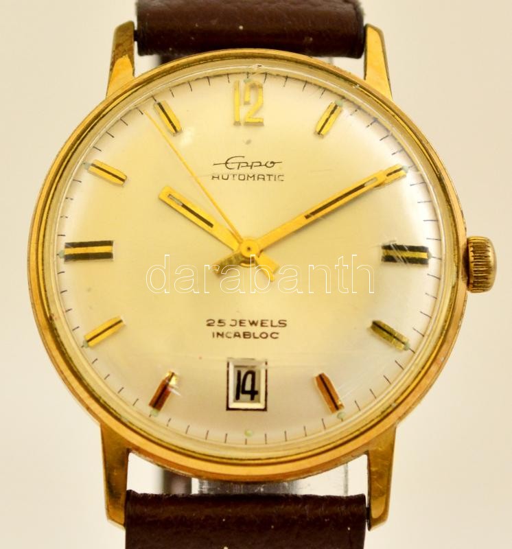 Leírás: Eppo 25 jewels incabloc, német férfi karóra, működik, karcos üveggel, naptáras, bőr szíjjal