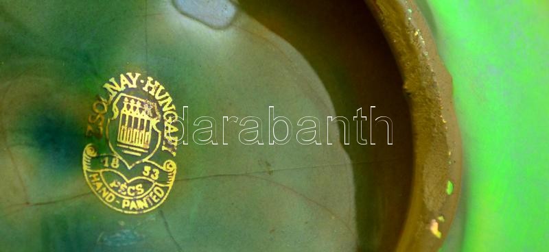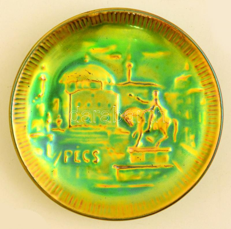 Leírás: Zsolnay eozin mázas tálka (Pécs főterével), jelzett, hibátlan, d:11 cm
