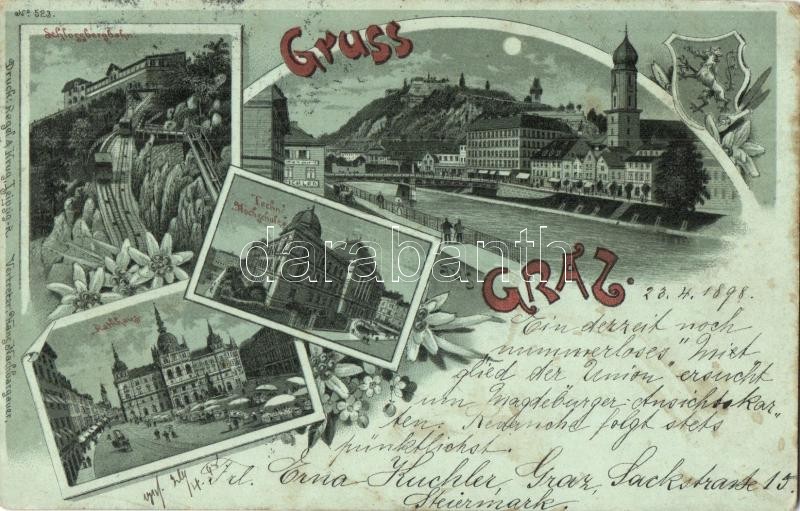 1898 Graz, Schlossbergbahn, Techn. Hochschule, Rathaus, Albrechtbrücke... https://www.darabanth.com/hu/327-Gyorsarveres/327.0/Kepeslapok/Ausztria~1000019/1898-Graz-Schlossbergbahn-Techn-Hochschule-Rathaus-Albrechtbrucke-RegelKrug-No-523-funic~II1821065