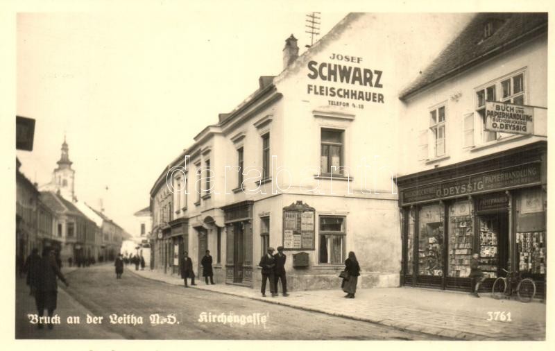 Lajtabruck, Bruck an der Leitha; Templom utca, Josef Schwarz hentes és O. Deyssig papír és könyv üzlete / Kirchengasse, Josef Schwarz Fleischhauer, O. Deyssig Buch und Papierhandlung / street view, church, shops