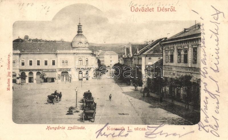 1903 Dés, Dej; tér, Hungária szálloda, Kossuth Lajos utca, Klein Ignátz, Rehák Ágoston, Bakó Mihály és Fesztinger Sámuel üzlete / square, street, hotel, shops (fa)