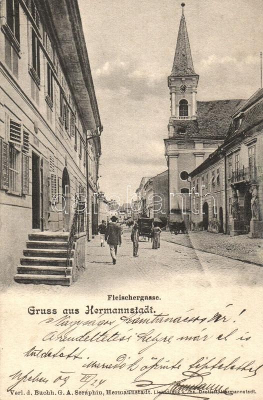 1909 Nagyszeben, Hermannstadt, Sibiu; Mészáros utca / Fleishergasse / ... https://www.darabanth.com/hu/327-Gyorsarveres/327.0/Kepeslapok/Erdely~1000007/1909-Nagyszeben-Hermannstadt-Sibiu-Meszaros-utca-Fleishergasse-srtreet-view~II1822662