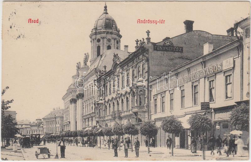 Leírás: 1911 Arad, Andrássy tér, Steigerwald A. bútorgyáros üzlete, Ravasz Imre fényképész, Morgenstern Gyula fogászata, Hegedűs Gy. üzlete / square, shops, photographer, dentistry