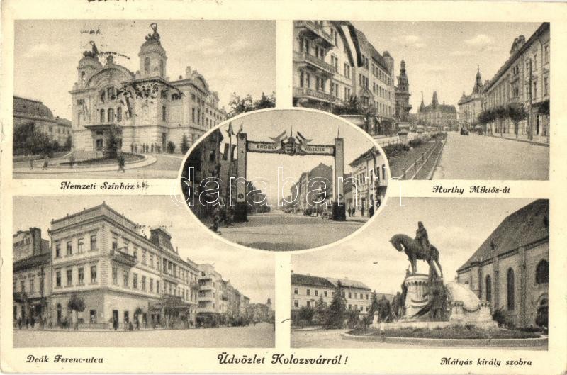 1940 Kolozsvár, Cluj; Nemzeti Színház, Horthy Miklós út, Deák Ferenc utca, Mátyás király szobor, a bevonulás "Erdély visszatér" feliratú díszkapuja / National Theater, street view, statue, entry of the Hungarian troops, irredenta, decorated gate (EK)
