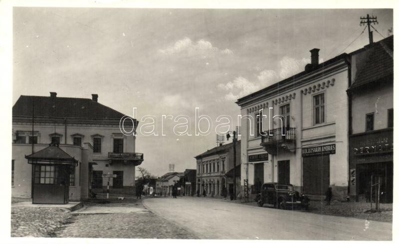 Bánffyhunyad, Huedin; utca, Tigris szálló, Kolozsvári András és Albert Lázár üzlete, Hangya, Patika, Szilágyi Márton vendéglője és étterme, automobil / street view, hotel, shops, restaurant, pharmacy, automobile (hiányzó rész / missing part)