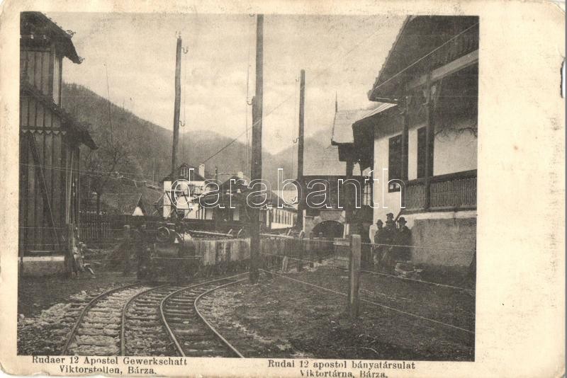 Leírás: Brád, Rudai 12 apostol bányatársulat, Viktória tárna aranybánya-bejárata Bárza (Gurabárza) felől, iparvasút, bányászok / gold mine entrance from Barza (Gura-Barza), industrial railway, mine workers (b)