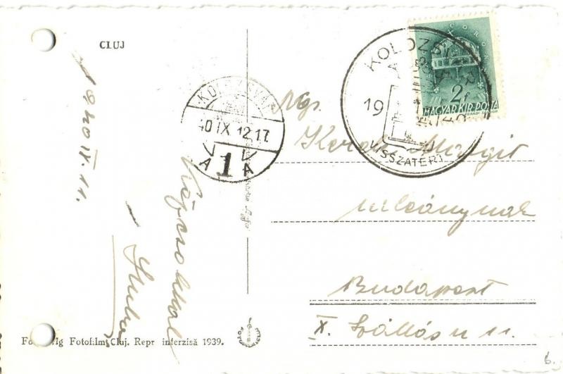 Leírás: Kolozsvár, Cluj; Teologia reformata, Farmacie / Református Teológiai Intézet, Gyógyszertár, Bindácz, Sallak üzlete / Protestant Theological Institute, pharmacy, shops (lyukasztott / punched holes) + 1940 Kolozsvár visszatért So. Stpl.