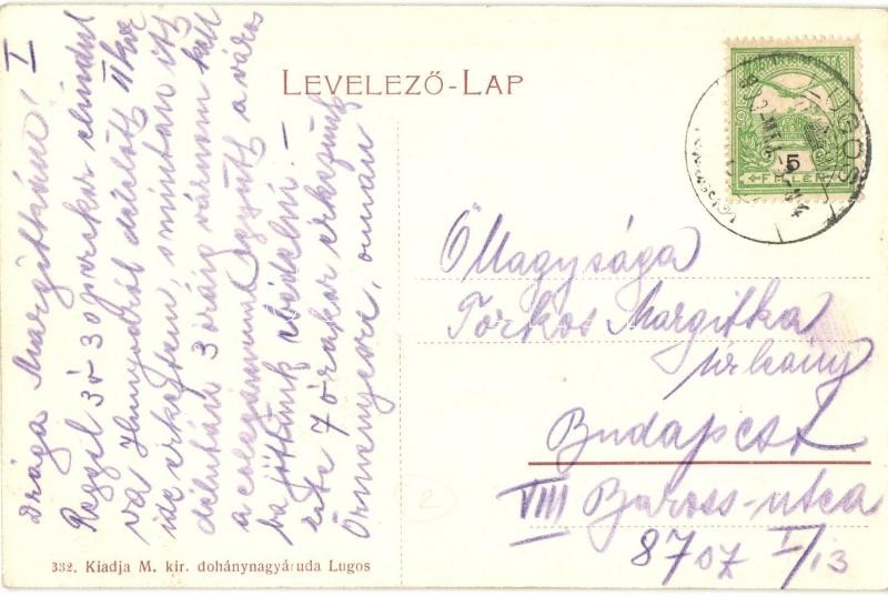 Leírás: Lugos, Lugoj; Vármegyeház, piac árusokkal. W.L. (?) 332. Kiadja M. kir. dohánynagyáruda / county hall, market vendors