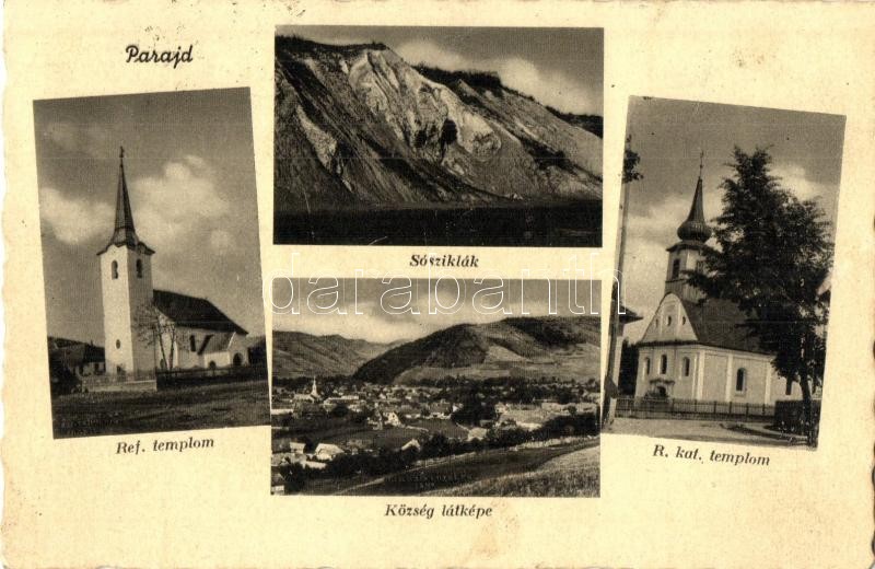 Parajd, Praid; Református templom, Sósziklák, Római katolikus templom, Község látképe. Kiss fényképész / Calvinist church, salt rocks, Catholic church, general view