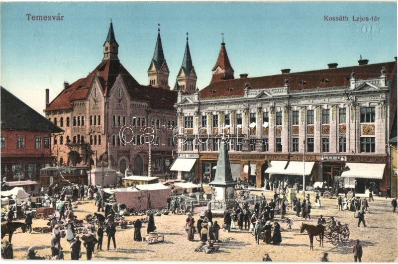 Temesvár, Timisoara; Kossuth Lajos tér, piac, villamos, Délmagyarországi Jelzálog Hitelbank, Weisz Sándor, Gaszner Ferenc, Wilheim Fülöp, Goldmann S. és Haring Gusztáv üzlete / square, market, tram, shops