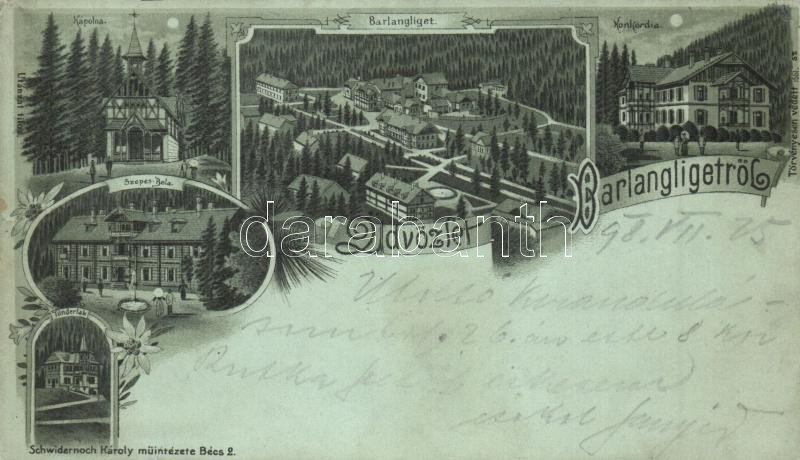 Leírás: 1898 Tátra, Barlangliget, Höhlenhain, Tatranská Kotlina; Konkordia, Kápolna, Szepes Béla, Tündérlak / hotels, villas, chapel. floral, Art Nouveau, litho