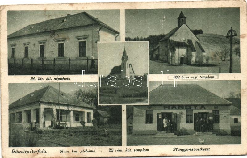 Gömörpéterfala, Petrovce; M. kir. állami népiskola, Új római katolikus és a 800 éves régi templom, Római katolikus plébánia, Hangya szövetkezet / churches, school, parish, cooperative shop (fa)