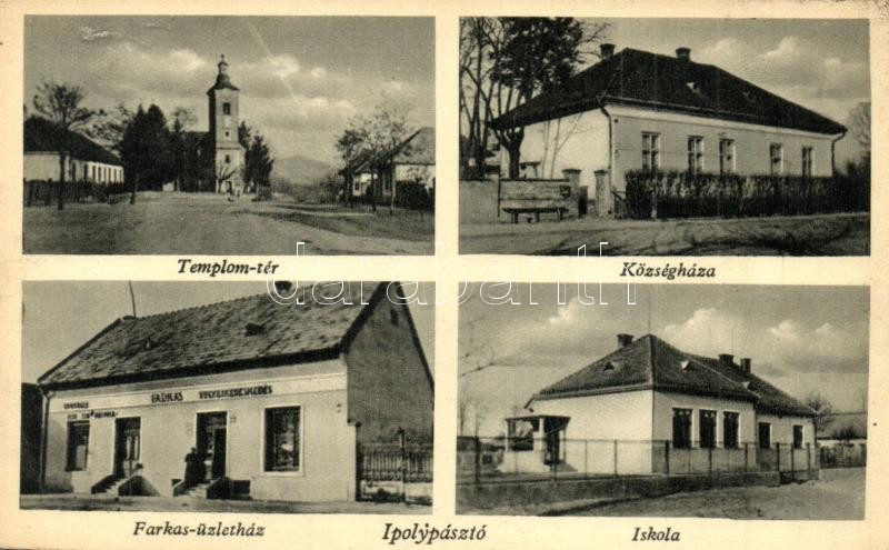 Ipolypásztó, Pásztó, Pastovce; Templom tér, Református templom, Községháza, Iskola, Farkas üzletház. Farkas Lászlóné saját kiadása / Calvinist church, square, town hall, school, publisher's shop (Rb)