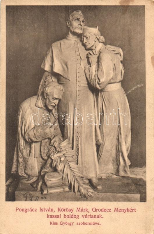 Leírás: Kassa, Kosice; Pongrácz István, Körösy Márk, Grodecz Menyhért kassai boldog vértanúk. Kiss György szoborműve. A kassai premontrei főgimnázium Mária Egyesületének kiadása / martyrs statue, monument (fl)