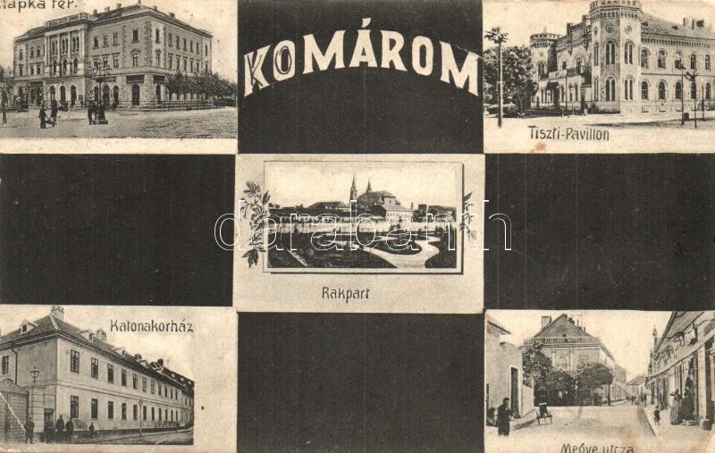 Komárom, Komárno; Klapka tér, Tiszti pavilon, Rakpart, Katona kórház, Megye utca, Központi szálloda. E. D. K. 192. / square, officers' pavilion, quay, street view, K.u.K. military hospital, hotel (kopott sarkak / worn corners)