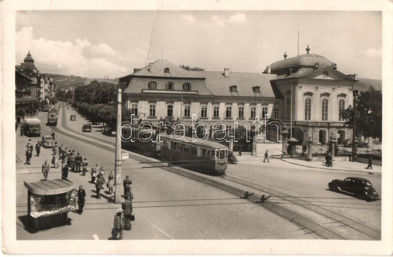 Leírás: Pozsony, Pressburg, Bratislava; Hodzovo nám, Stefánikova ul. / Hodz tér, Stefánia utca, villamos, újságárus, automobilok / street, square, tram, newspaper shop, automobiles (fa)