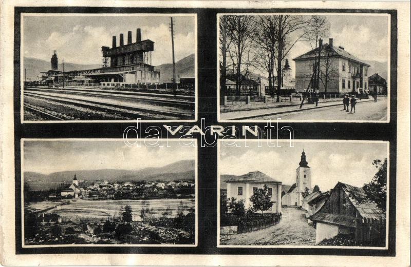 Leírás: Várna, Varín; Vasútállomás, híd a Vág folyón, Római katolikus templom / railway station, Váh river bridge, Catholic church (r)