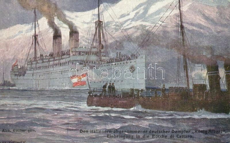 Den italienern abgenommener deutscher Dampfer "König Albert", Einbringung in die Bocche di Cattaro / WWI Naval art postcard, SS König Albert captured by the Italians. Rotes Kreuz Kriegsfürsorgeamt Kriegshilfsbüro Nr. 562. s: Alex Kircher